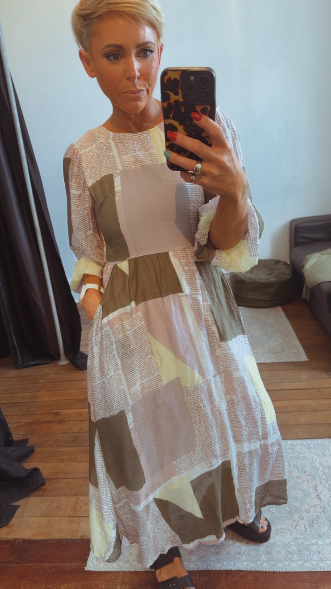 So Instyle Newspaper Print Viscose Polyester Tie Back Dress Olive