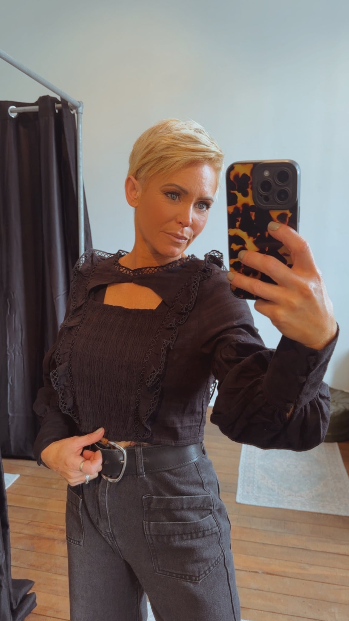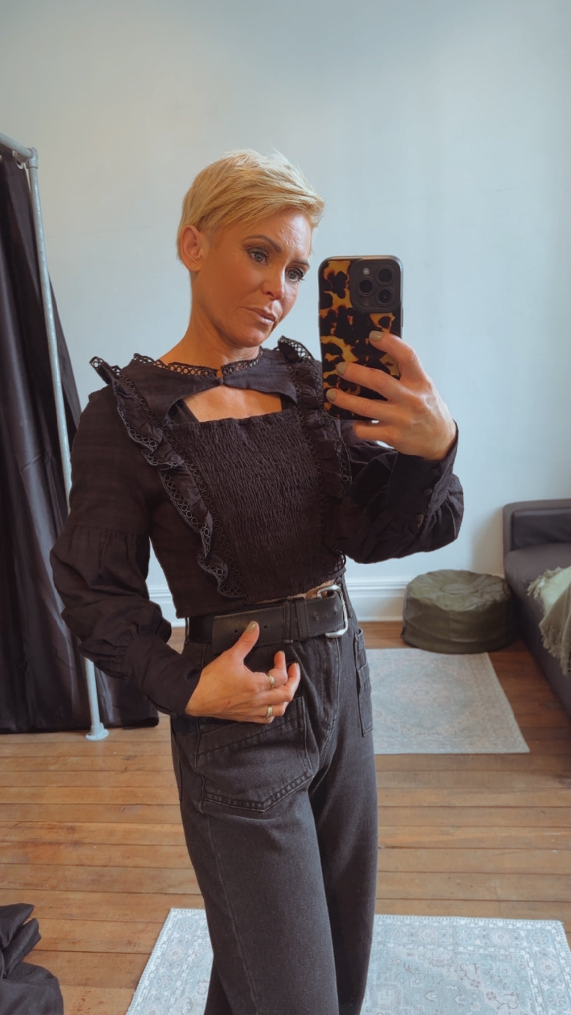 Refuge Boho ruffle mid length top shirring front crochet lace trim back button up neck cotton black