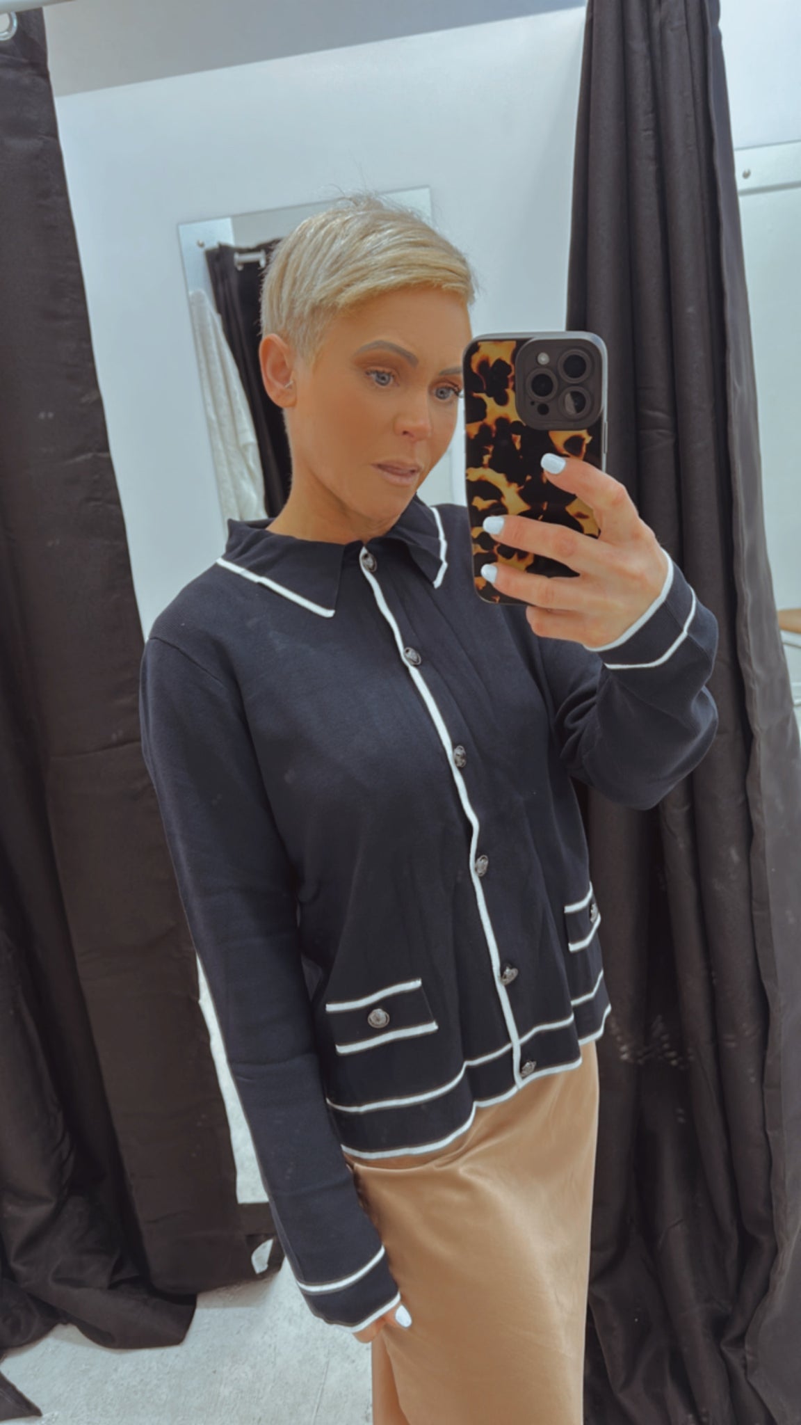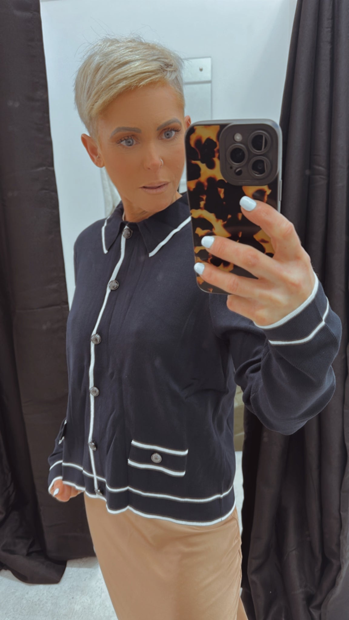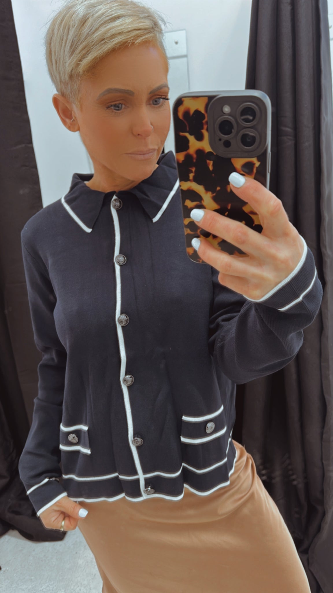 Sunny Girl collared structured button through Acrylic Elastane Navy with white trim front pocket cardi