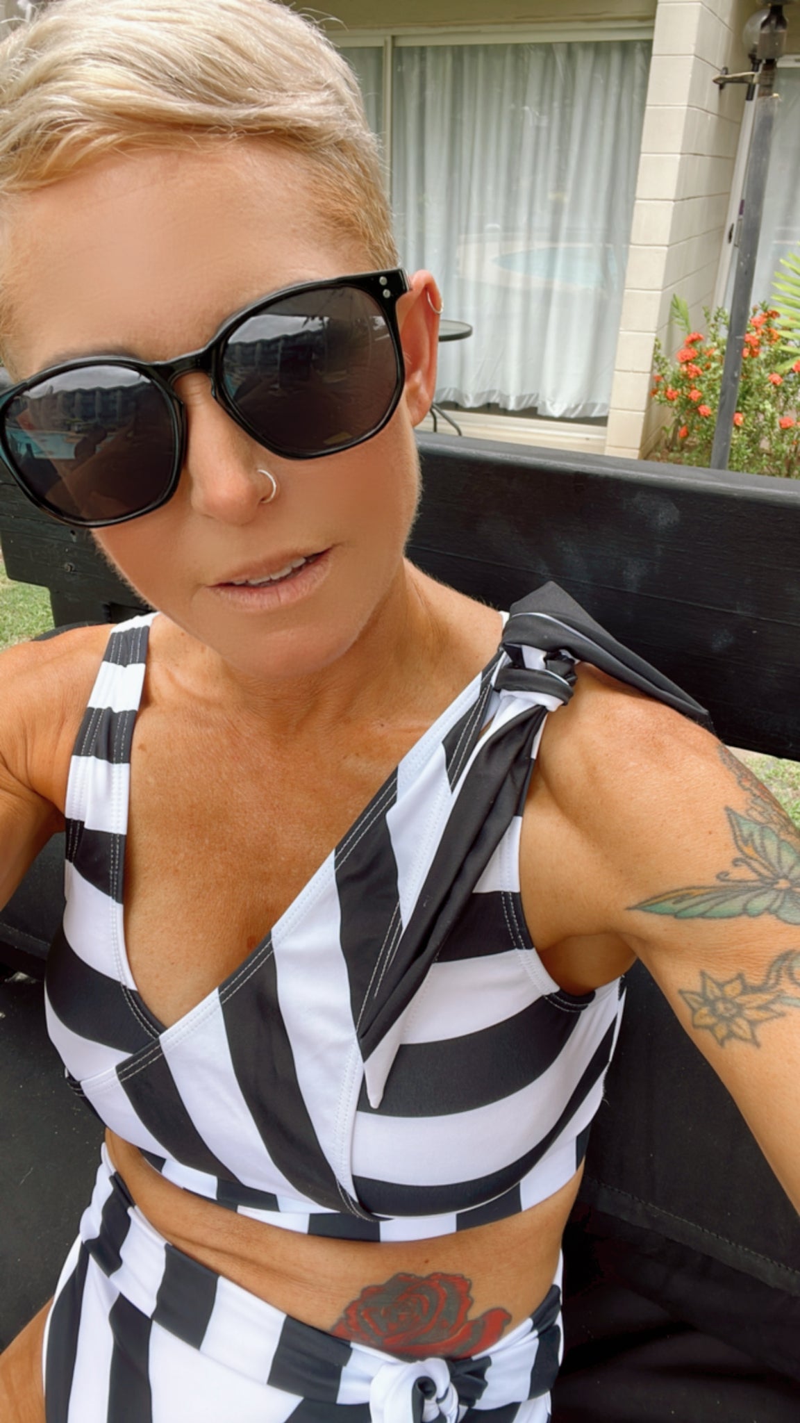 Black & white stripe high waist wide waistband tie shoulder detail padded bra bikini